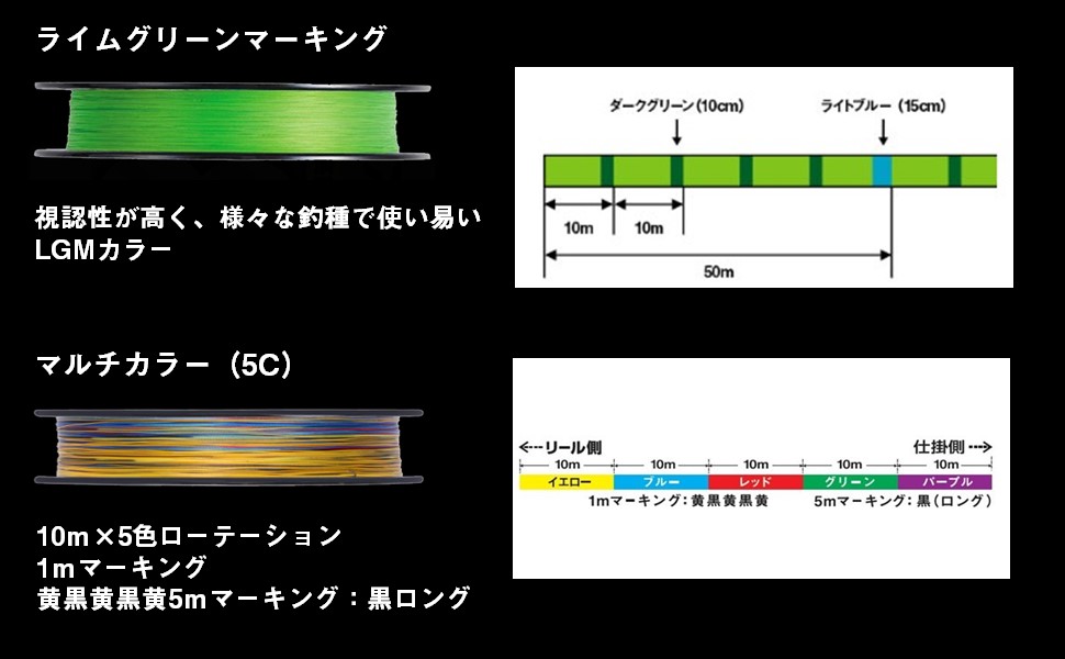 • マルチカラー(10mごとの色分け) : 飛距離や水深を把握しやすいが、サワラ狙いでは白いマーカー部分で切られるリスクが高まるため、避けた方が無難。